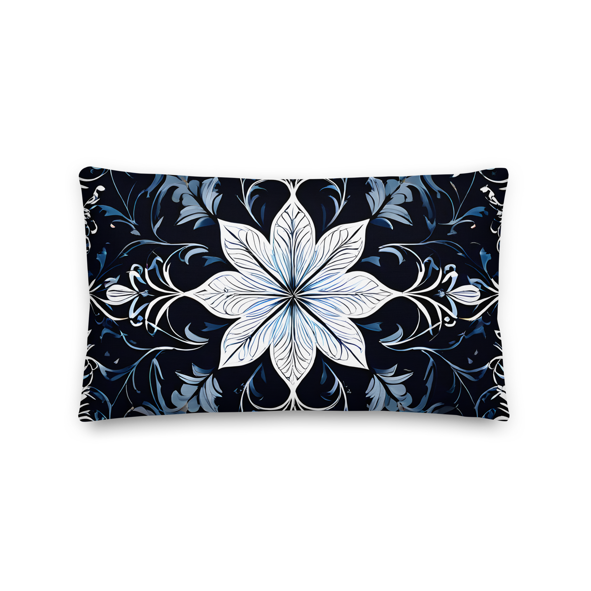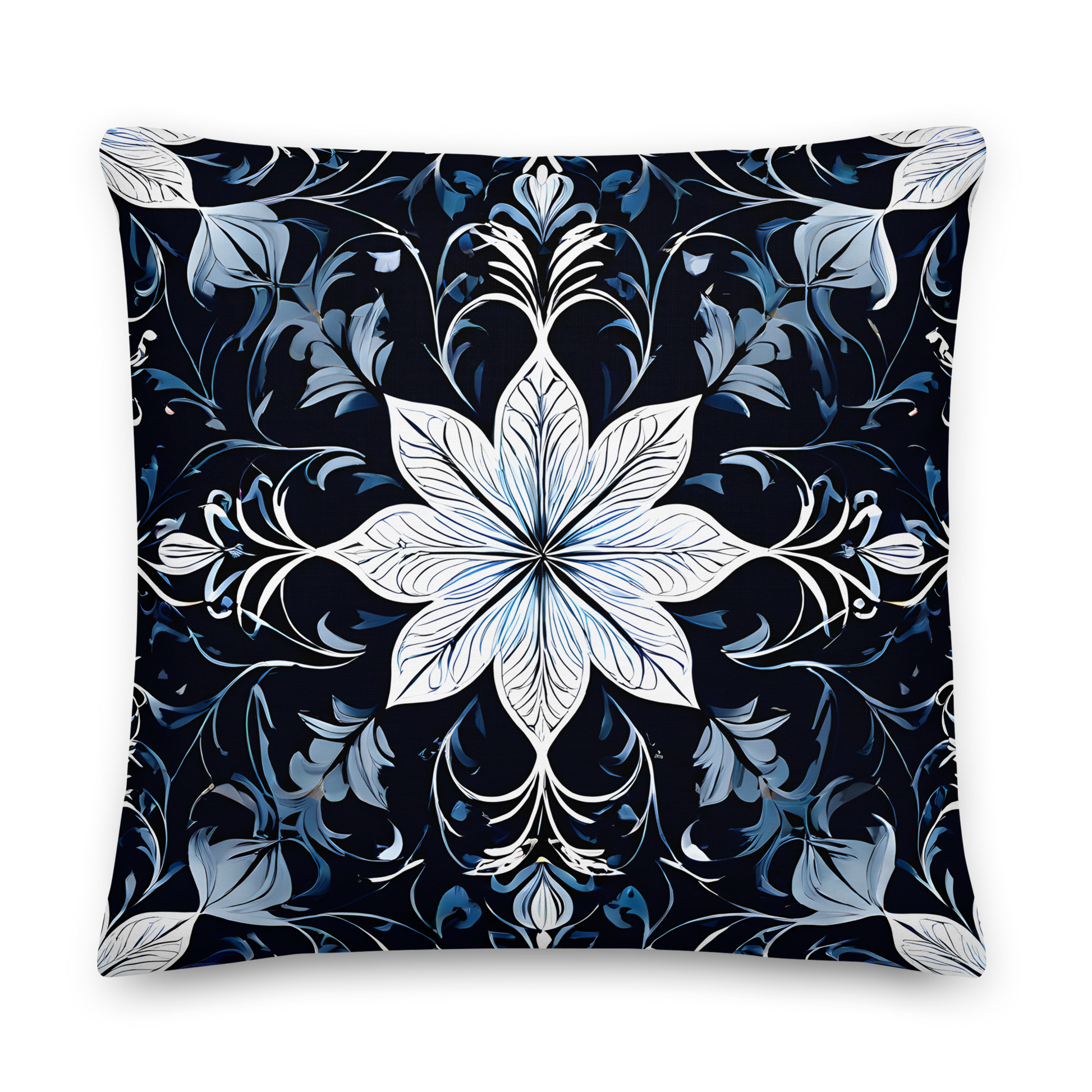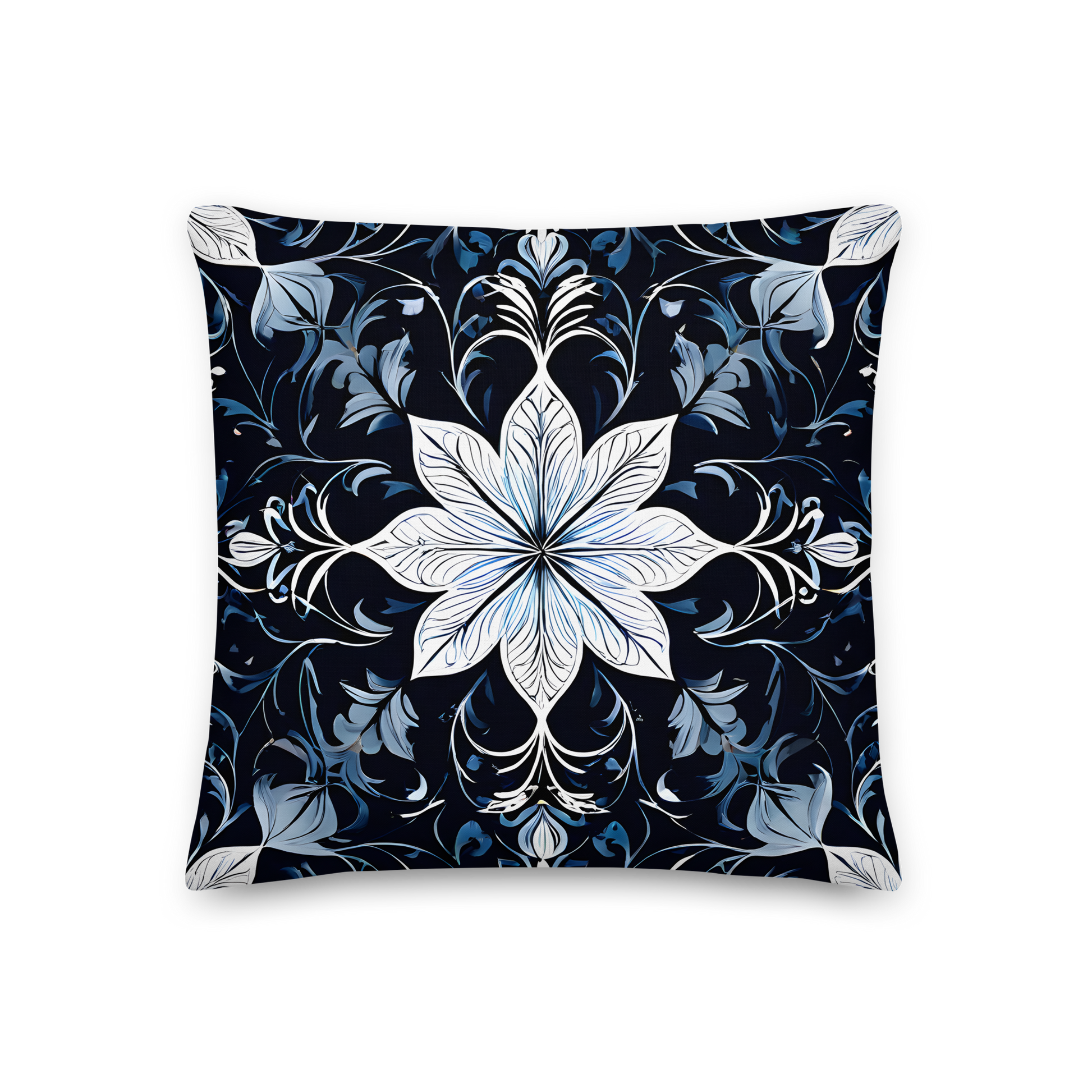 Discover the incomparable world of our decorative cushions that will transform your home into an oasis of sophistication. The design of this pillow was inspired by the beauty and elegance of the Renaissance. The central white flower with its delicate lines and details represents the grace and splendor of a blossom. The surrounding dark blue and light blue floral elements represent the diversity and abundance found in a blooming garden.
