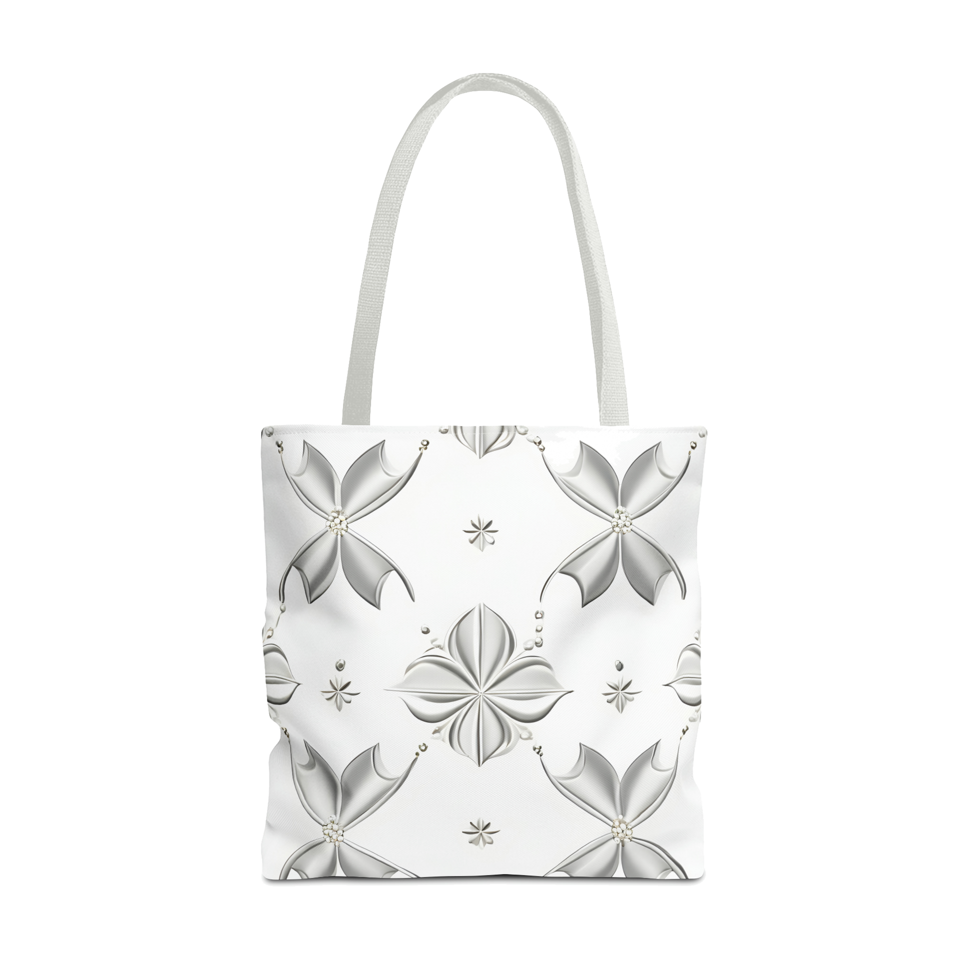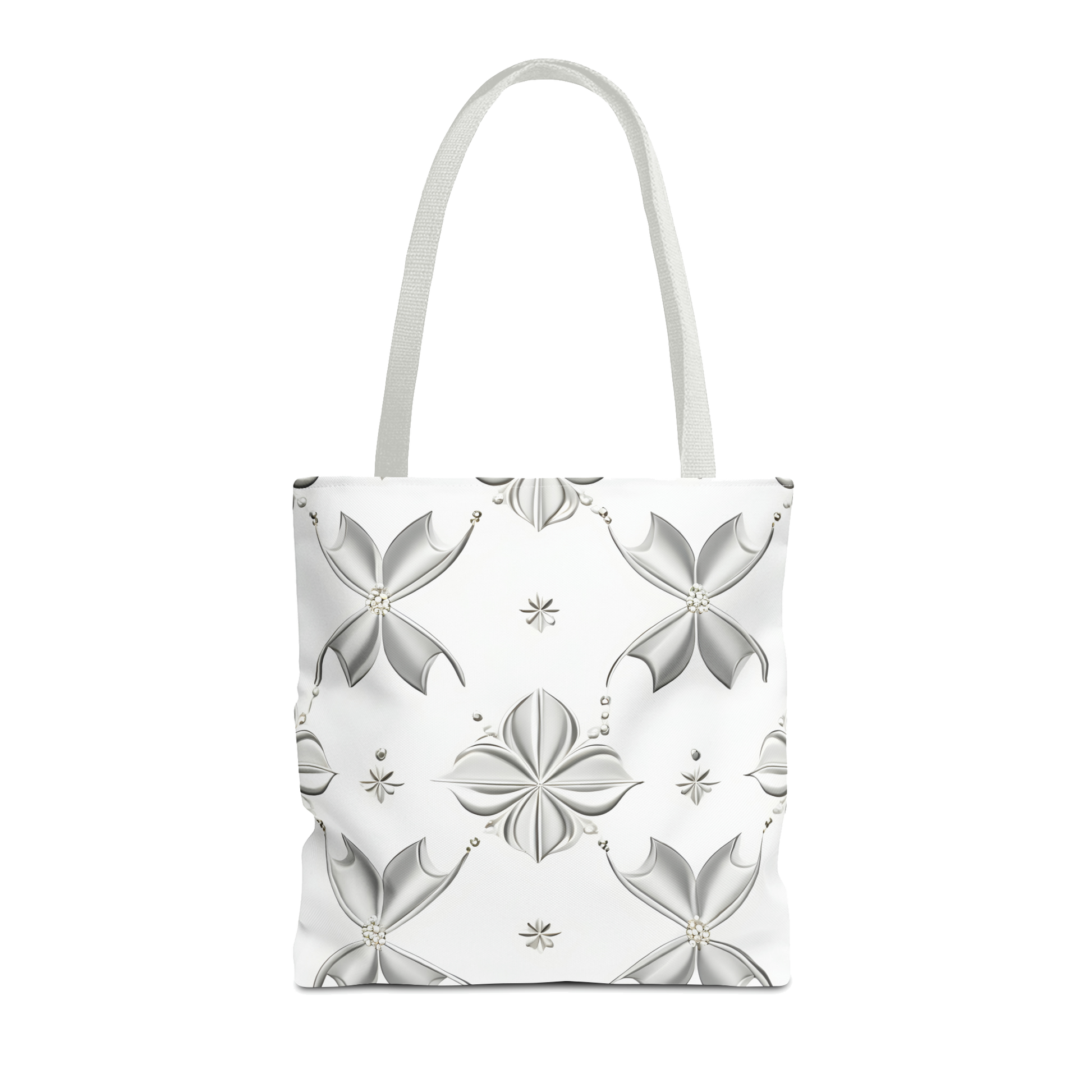 This tote bag's ornate pattern is a fusion of natural motifs and geometric elegance. Silver floral designs are reminiscent of delicate petals and delicate snowflakes, artfully arranged in perfect symmetry. Every detail is finely crafted, from the floral lines to the geometric shapes. The white carrying handles blend in harmoniously, complete the picture and give the bag a timeless elegance with modern sophistication. A work of art that expresses the beauty of nature in a bag.