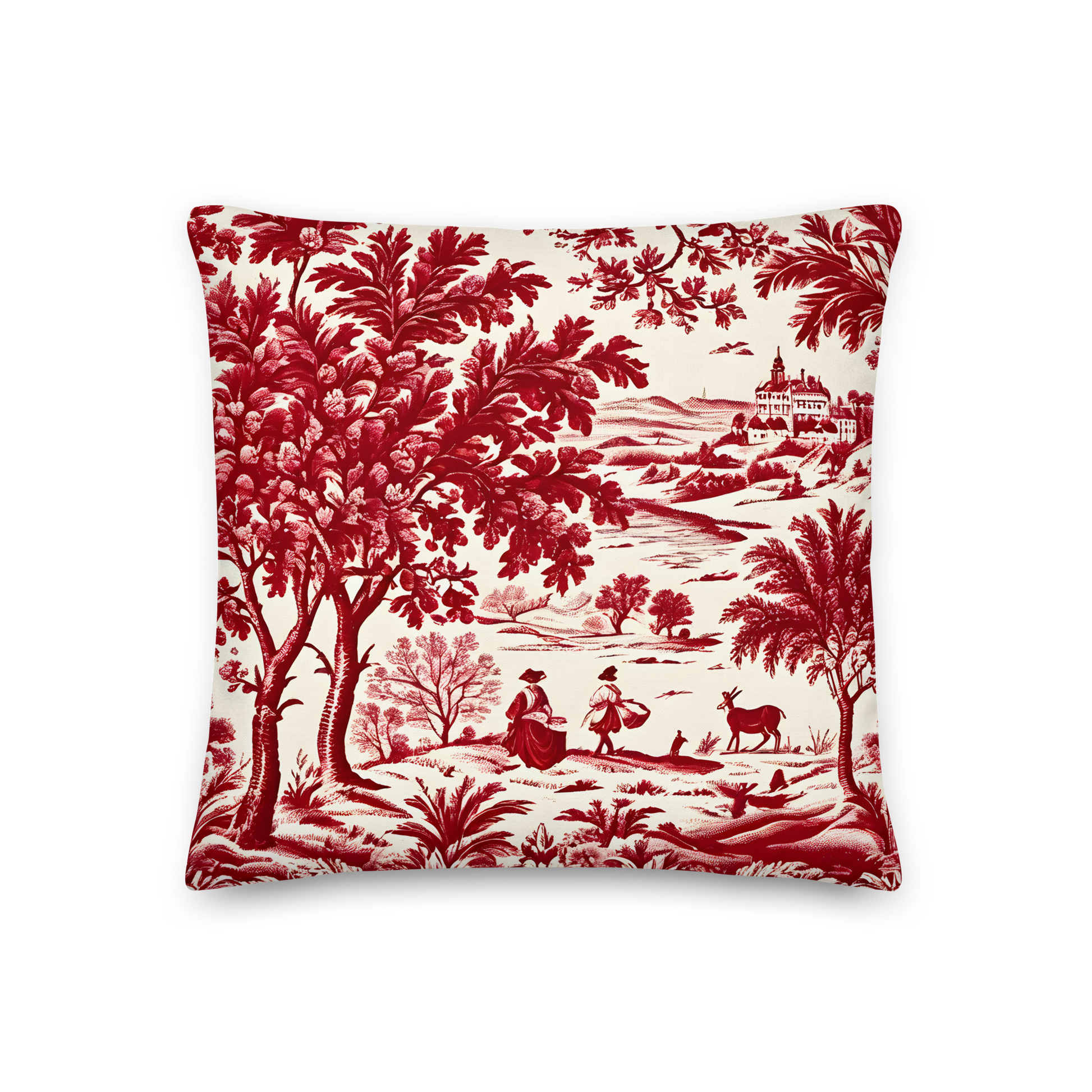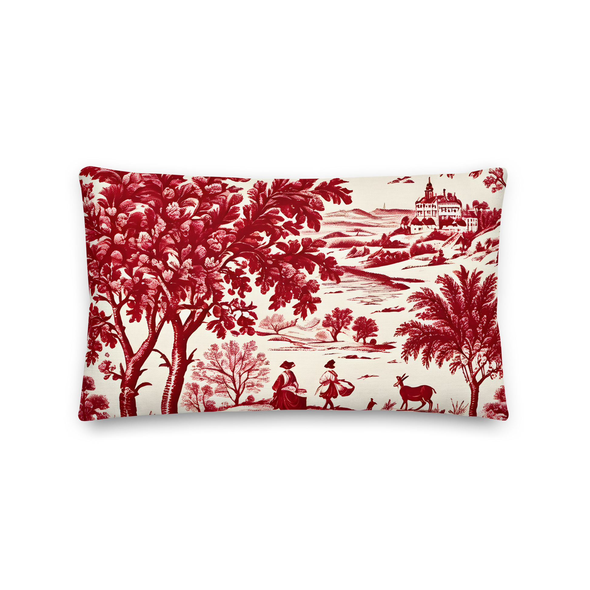 Discover the incomparable world of our decorative cushions that will transform your home into an oasis of sophistication. The complex pattern in the Toile de Jouy style is reminiscent of idyllic rurality. Rendered in vibrant red on pure white, lush trees and relaxing people create a harmonious scene. The crisp color scheme highlights every detail, while the buildings in the distance add subtle depth.