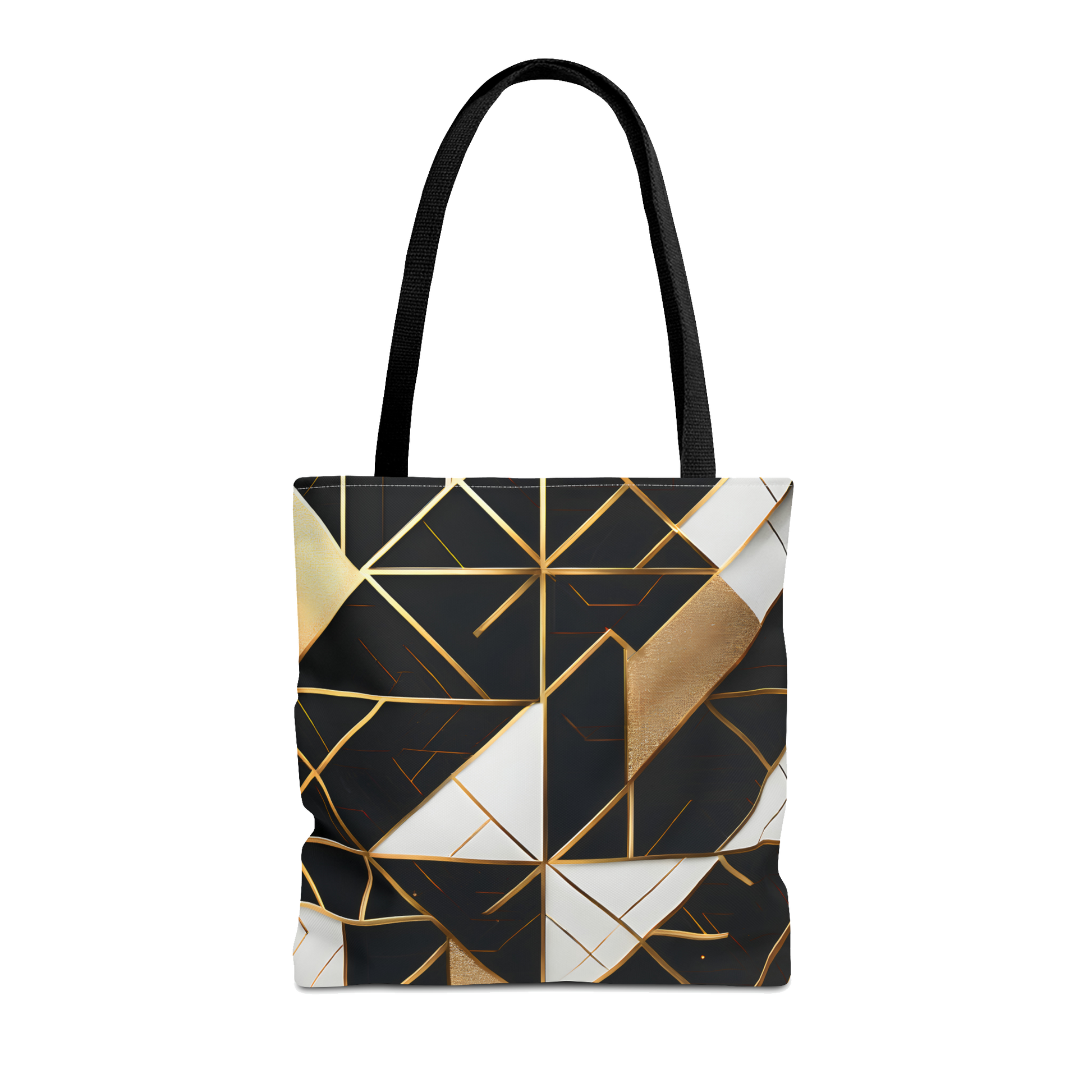 The ornate pattern on this tote bag pays homage to the beauty and precision of geometry. Every detail has been designed with the utmost care to create a three-dimensional masterpiece that captivates the senses. The harmonious combination of black and white creates a powerful contrast, while the gold accents add a touch of elegance and luxury - a timeless symbol of sophistication. The triangles, arranged in a fascinating play of tips and bases, evoke a feeling of movement and rhythm. The gold lines emphasize the connections between the shapes and give the pattern additional depth and structure.