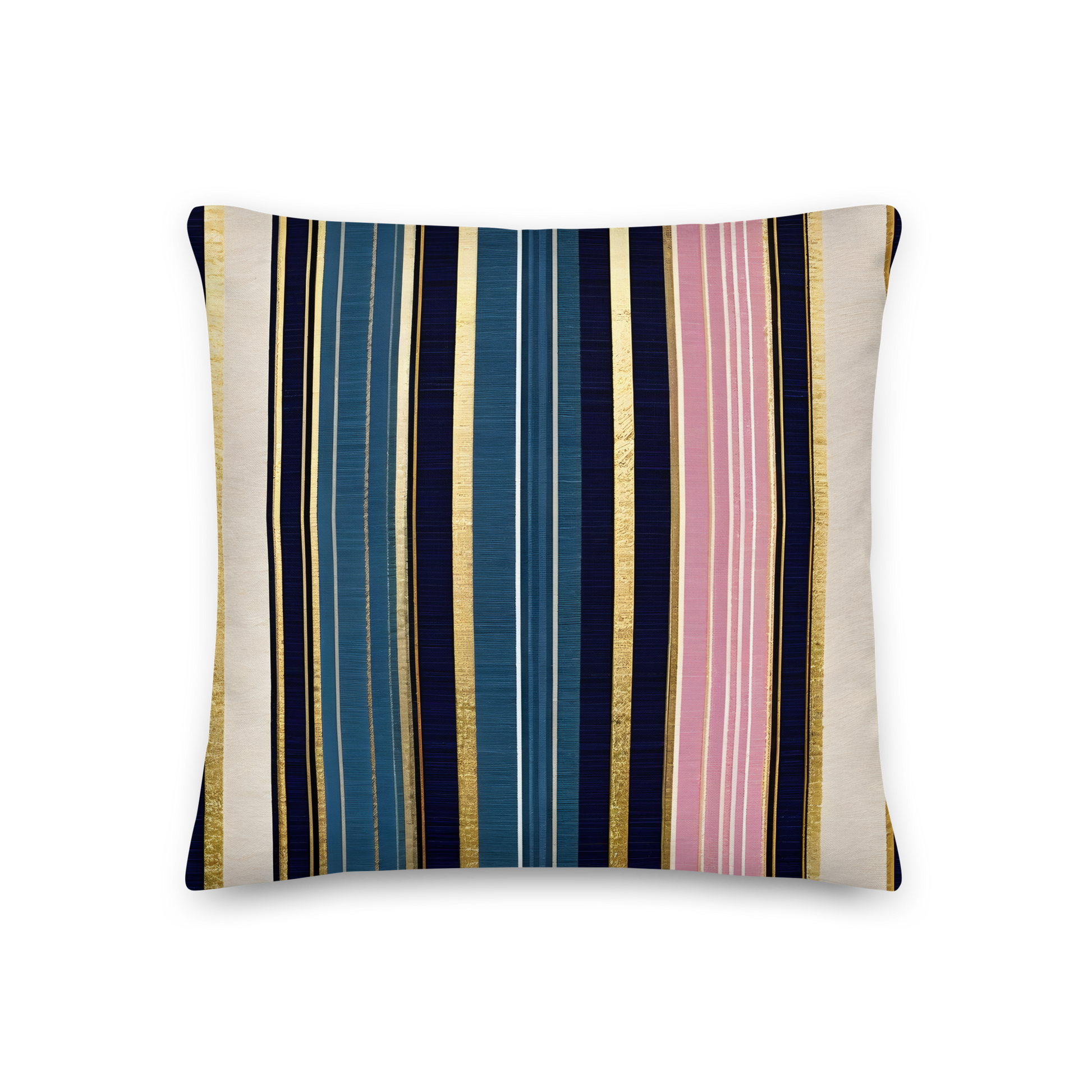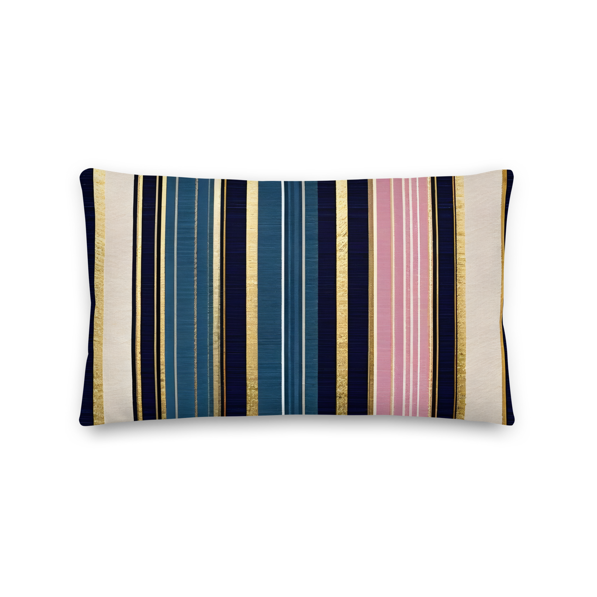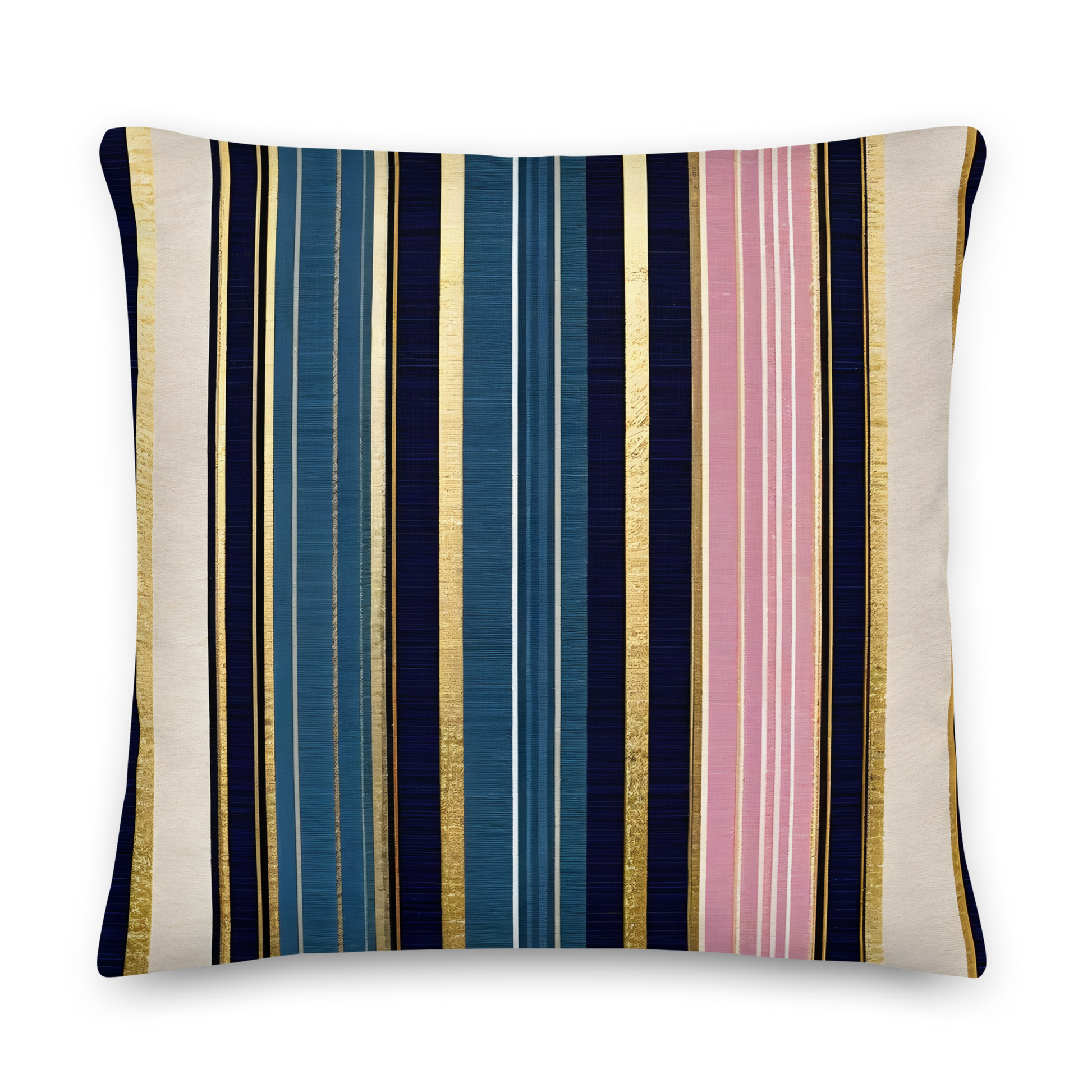 Ontdek de onvergelijkbare wereld van onze sierkussens die uw huis zullen transformeren in een oase van verfijning. Dit kussen is een eerbetoon aan Hollywood-glitter en combineert verticale strepen in donker- en lichtblauw met delicate goud- en roze tinten. De glinsterende gouden strepen doen denken aan kostbare sieraden, geïnspireerd door tijdloze elegantie en glamour. Een vleugje Hollywood Regency vastgelegd in een luxueus patroon.